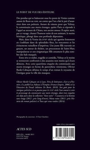 Entre rêve et réalité, tragédie et comédie, Volnay et le moine se retrouvent confrontés à des assassins non moins qu'à leurs démons. Avec cette quatrième enquête du commissaire aux morts étranges en forme de parenthèse vénitienne, Olivier Barde-Cabuçon délaisse le temps d'un roman le royaume de l'intrigue pour la ville des masques.