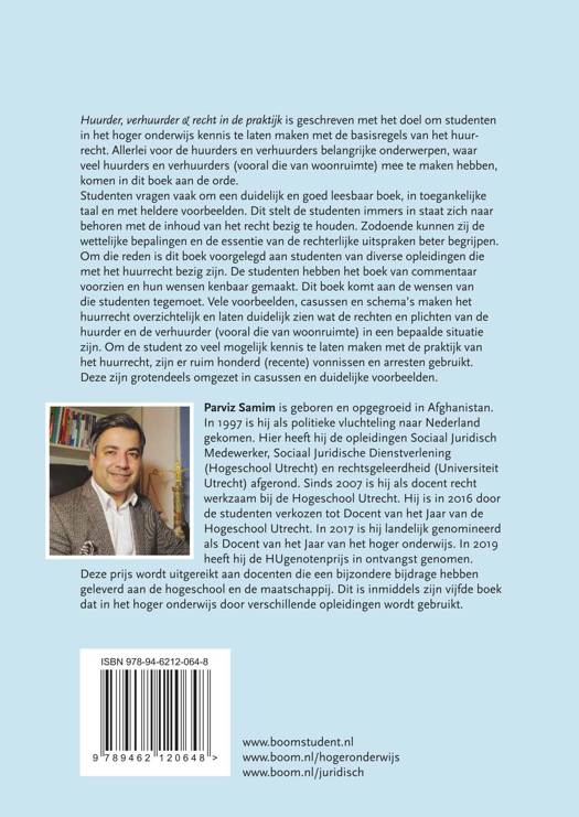 Huurder, verhuurder & recht in de praktijk is geschreven met het doel om studenten in het hoger onderwijs kennis te laten maken met de basisregels van het huurrecht. Allerlei voor de huurders en verhuurders belangrijke onderwerpen, waar veel huurders en verhuurders (vooral die van woonruimte) mee te maken hebben, komen in dit boek aan de orde. Studenten vragen vaak om een duidelijk en goed leesbaar boek, in toegankelijke taal en met heldere voorbeelden. Dit stelt de studenten immers in staat zich naar behoren met de inhoud van het recht bezig te houden. Zodoende kunnen zij de wettelijke bepalingen en de essentie van de rechterlijke uitspraken beter begrijpen. Om die reden is dit boek voorgelegd aan studenten van diverse opleidingen die met het huurrecht bezig zijn. De studenten hebben het boek van commentaar voorzien en hun wensen kenbaar gemaakt. Dit boek komt aan de wensen van die studenten tegemoet. Vele voorbeelden, casussen en schema’s maken het huurrecht overzichtelijk en laten duidelijk zien wat de rechten en plichten van de huurder en de verhuurder (vooral die van woonruimte) in een bepaalde situatie zijn. Om de student zo veel mogelijk kennis te laten maken met de praktijk van het huurrecht, zijn er ruim honderd (recente) vonnissen en arresten gebruikt. Deze zijn grotendeels omgezet in casussen en duidelijke voorbeelden. Parviz Samim is geboren en opgegroeid in Afghanistan. In 1997 is hij als politieke vluchteling naar Nederland gekomen. Hier heeft hij de opleidingen Sociaal Juridisch Medewerker, Sociaal Juridische Dienstverlening (Hogeschool Utrecht) en rechtsgeleerdheid (Universiteit Utrecht) afgerond. Sinds 2007 is hij als docent recht werkzaam bij de Hogeschool Utrecht. Hij is in 2016 door de studenten verkozen tot Docent van het Jaar van de Hogeschool Utrecht. In 2017 is hij landelijk genomineerd als Docent van het Jaar van het hoger onderwijs. In; heeft hij de HUgenotenprijs in ontvangst genomen. Deze prijs wordt uitgereikt aan docenten die een bijzondere bijdrage hebben geleverd aan de hogeschool en de maatschappij. Dit is inmiddels zijn vijfde boek dat in het hoger onderwijs door verschillende opleidingen wordt gebruikt