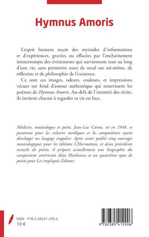 L'esprit humain reçoit des myriades d'informations et d'expériences, gravées ou effacées par l'enchaînement ininterrompu des événements qui surviennent tout au long d'une vie, sans permettre assez de recul sur soi-même, de réflexion et de philosophie de l'existence. Ce sont ces images, odeurs, couleurs, et impressions vécues sur fond d'amour authentique qui nourrissent les poèmes de Hymnus Amoris. Au-delà de l'intimité des récits, ils invitent chacun à regarder sa vie en face.