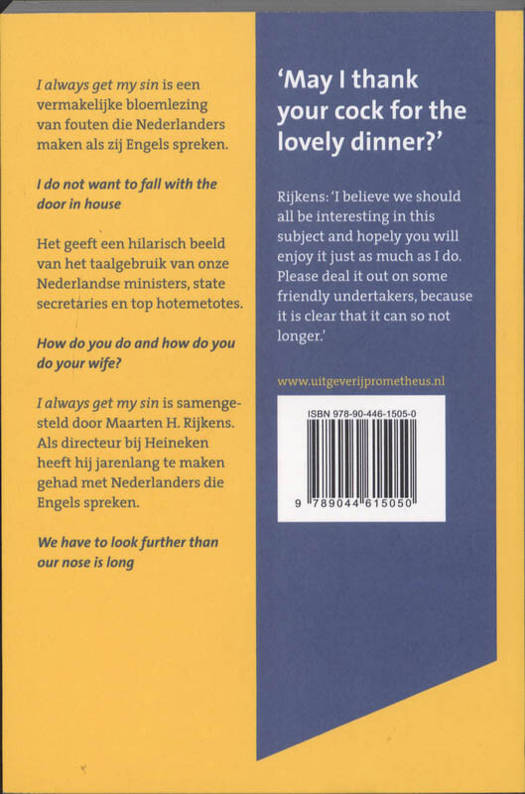 I always get my sin is een vermakelijke bloemlezing van fouten die Nederlanders maken als zij Engels spreken.