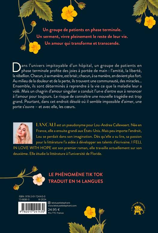 LANCALI est un pseudonyme pour Lou-Andrea Callewaert. Née en France, elle a ensuite grandi aux États-Unis. Mais peu importe l’endroit, Lou se perdait dans son imagination. Dès qu’elle a su lire, sa passion pour la littérature l’a aidée à développer ses talents d’écrivaine. I FELL IN LOVE WITH HOPE est son premier roman, elle travaille actuellement sur son deuxième. Elle étudie la littérature à l’université de Floride.