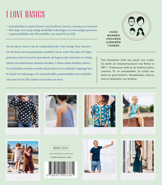 Na het grote succes van de naaiboekenreeks I love brengt Fran Vanseveren dit boek met de populairste modellen uit de reeks. Met deze 20 hippe patronen creëert zowel de gevorderde als beginnende naai(st)er in weinig tijd tal van mooie basics: sweaters, hoodies, T-shirts, rokjes, broeken, shorts ... De werkwijzen worden nauwkeurig beschreven en duidelijk uitgelegd aan de hand van tekeningen. De overzichtelijke patroonbladen met modellen van maat 92 tot XXL maken van naaien een feest.