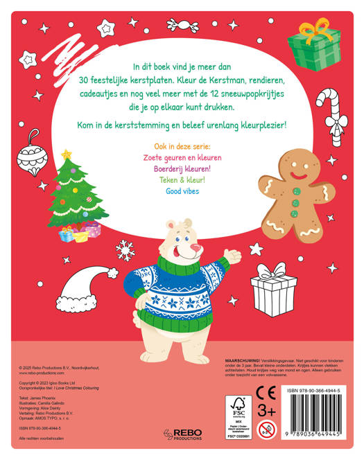 In dit boek vind je meer dan 30 feestelijke kerstplaten. Kleur de Kerstman, rendieren, cadeautjes en nog veel meer met de 12 sneeuwpopkrijtjes die je op elkaar kunt drukken. Kom in de kerststemming en beleef urenlang kleurplezier!