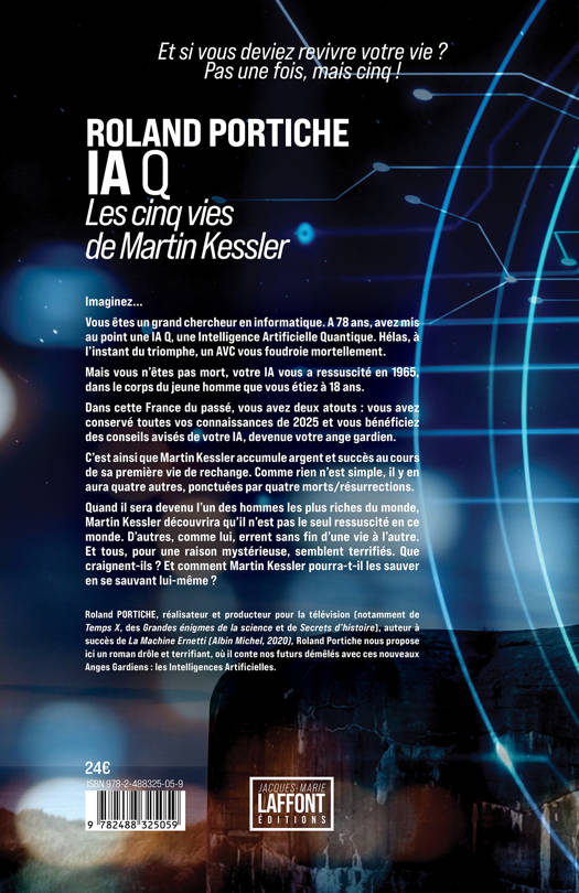 Imaginez... Vous êtes un grand chercheur en informatique. À 78 ans, avez mis au point une IA Q, une Intelligence Artificielle Quantique. Hélas, à l'instant du triomphe, un AVC vous foudroie mortellement. Mais vous n'êtes pas mort, votre IA vous a ressuscité en 1965, dans le corps du jeune homme que vous étiez à 18 ans. Dans cette France du passé, vous avez deux atouts : vous avez conservé toutes vos connaissances de 2025 et vous bénéficiez des conseils avisés de votre IA, devenue votre ange gardien. C'est ainsi que Martin Kessler accumule argent et succès au cours de sa première vie de rechange. Comme rien n'est simple, il y en aura quatre autres, ponctuées par quatre morts/résurrections. Quand il sera devenu l'un des hommes les plus riches du monde, Martin Kessler découvrira qu'il n'est pas le seul ressuscité en ce monde. D'autres, comme lui, errent sans fin d'une vie à l'autre. Et tous, pour une raison mystérieuse, semblent terrifiés. Que craignent-ils ? Et comment Martin Kessler pourra-t-il les sauver en se sauvant lui-même ?