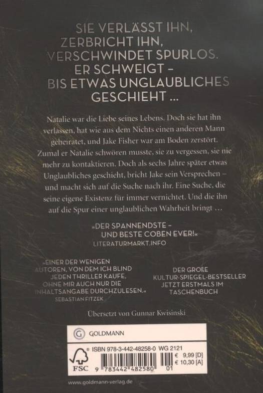 Natalie war die Liebe seines Lebens. Doch sie hat ihn verlassen, hat wie aus dem Nichts einen anderen Mann geheiratet, und Jake Fischer war am Boden zerstört. Bei ihrem Abschied musste er Natalie zudem schwören, sie zu vergessen, sie nie mehr zu kontaktieren. Doch als sechs Jahre später etwas Unglaubliches geschieht, bricht Jake sein Versprechen -und macht sich auf die Suche nach ihr. Eine Suche, die seine eigene gutbürgerliche Existenz für immer zerstört. Und die ihm offenbart, dass die Frau, die er zu lieben glaubte, nie wirklich existiert hat ...