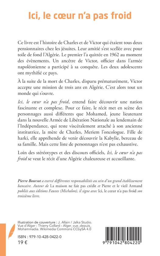 Ici, le cœur n’a pas froid, entend faire découvrir une nation fascinante et complexe. Pour ce faire, le récit met en scène des personnages aussi différents que Mohamed, jeune lieutenant dans la nouvelle Armée de Libération Nationale au lendemain de l’Indépendance, qui reste viscéralement attaché à son ancienne institutrice, la mère de Charles, Meriem l’oncologue. Fille de harki, elle appréhende de venir découvrir la Kabylie, berceau de sa famille. Mais cette liste de personnages n’est pas exhaustive.