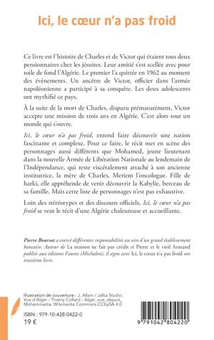 Ce livre est l’histoire de Charles et de Victor qui étaient tous deux pensionnaires chez les jésuites. Leur amitié s’est scellée avec pour toile de fond l’Algérie. Le premier l’a quittée en 1962 au moment des évènements. Un ancêtre de Victor, officier dans l’armée napoléonienne a participé à sa conquête. Les deux adolescents ont mythifié ce pays.