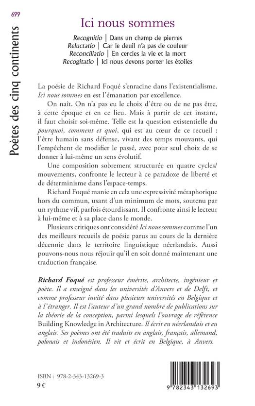 La poésie de Richard Foqué s'enracine dans l'existentialisme. Ici nous sommes en est l'émanation par excellence. On naît. On n'a pas eu le choix d'être ou de ne pas être, à cette époque et en ce lieu. Mais à partir de cet instant, il faut choisir soi-même. Telle est la question existentielle du pourquoi, comment et quoi qui est au coeur de ce recueil : l'être humain, sans défense, vivant des temps mouvants...L'auteur manie une expressivité métaphorique hors du commun, confronte le lecteur à ce paradoxe de liberté et de déterminisme dans l'espace-temps.