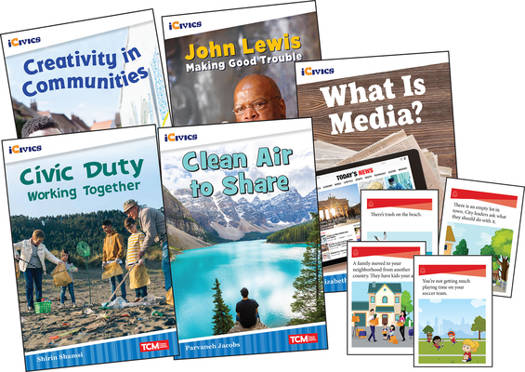 Introduce age-appropriate civics topics focusing on community and social awareness with this great third-grade reading set. Learn how creativity can help communities, discover why clean air is important, and examine media sources to determine reliability. This iCivics reading set introduces age-appropriate topics in meaningful and easy-to-understand ways. Each nonfiction book includes a fictional story to help readers understand and relate to the topic. To enhance the reading experience and build critical-thinking skills, each book features Read and Respond questions, Think and Talk callouts, and a Civics in Action activity to motivate readers to make a difference. This 5-book set also includes a deck of game cards with instructions for 3 different games to reinforce literacy and civics skills. This set includes: What Would You Do? Game Cards; Creativity in Communities; John Lewis: Making Good Trouble; Civity Duty; Working Together; Clean Air to Share; and What Is Media?