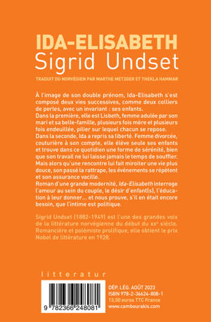 À l'image de son double prénom, Ida-Elisabeth s'est composé deux vies successives, comme deux colliers de perles, avec un invariant : ses enfants. Dans la première, elle est Lisbeth, femme adulée par son mari et sa belle-famille, plusieurs fois mère et plusieurs fois endeuillée, pilier sur lequel chacun se repose. Dans la seconde, Ida a repris sa liberté. Femme divorcée, couturière à son compte, elle élève seule ses enfants et trouve dans ce quotidien une forme de sérénité, bien que son travail ne lui laisse jamais le temps de souffler. Mais alors qu'une rencontre lui fait miroiter une vie plus douce, son passé la rattrape, les événements se répètent et son assurance vacille. Roman d'une grande modernité, Ida-Elisabeth interroge l'amour au sein du couple, le désir d'enfant(s), l'éducation à leur donner... et nous prouve, s'il en était encore besoin, que l'intime est politique.
