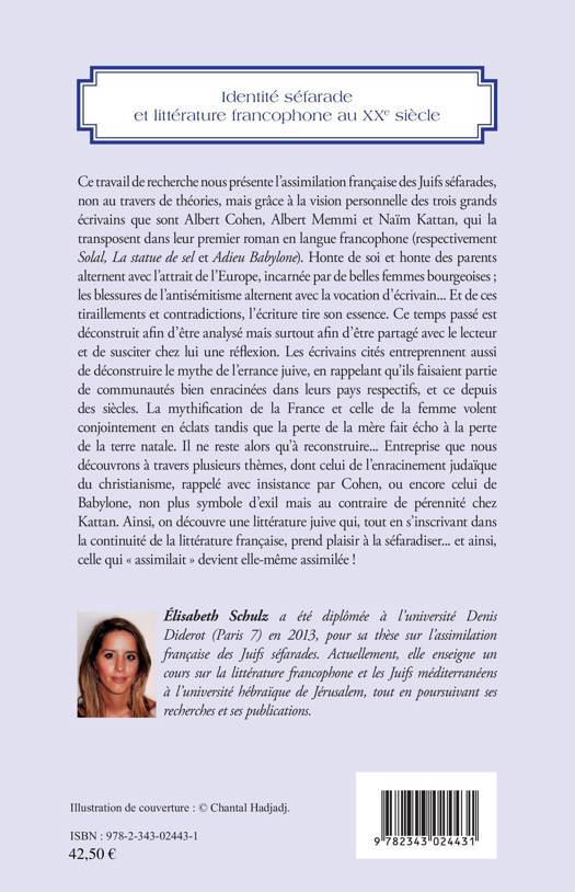 Cet ouvrage présente l'assimilation française des Juifs séfarades d'après la vision personnelle des écrivains Albert Cohen, Albert Memmi et Naïm Kattan, qui la transposent dans leurs romans respectifs Solal, La statue de sel et Adieu Babylone. Un mythe de l'errance juive y est déconstruit, la mythification de la France et celle de la femme volent conjointement en éclats tandis que la perte de la mère fait écho à la perte de la terre natale. Il ne reste alors qu'à reconstruire...