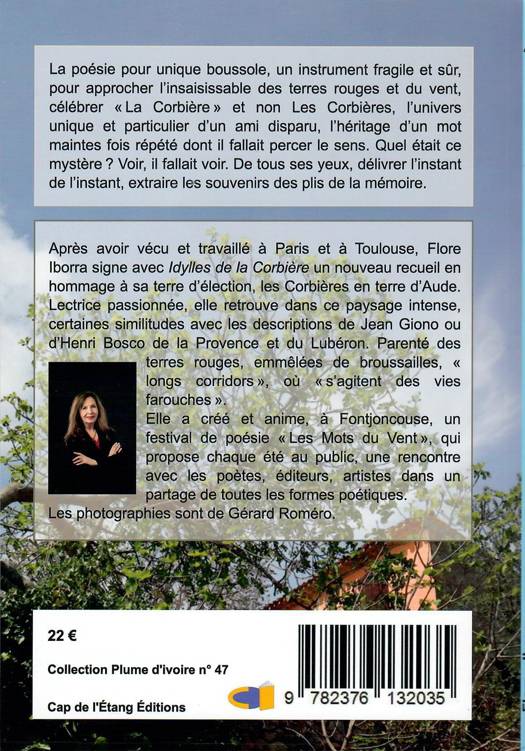 La poésie pour unique boussole, un instrument fragile et sûr, pour approcher l’insaisissable des terres rouges et du vent, célébrer « La Corbière » et non les Corbières, l’univers unique et particulier d’un ami disparu, l’héritage d’un mot maintes fois répété dont il fallait percer le sens. Quel était ce mystère ? Voir, il fallait voir. De tous ses yeux, délivrer l’instant de l’instant, extraire les souvenirs des plis de la mémoire. Après avoir vécu et travaillé à Paris et à Toulouse, Flore Iborra, signe avec Idylles de la Corbière un nouveau recueil en hommage à sa terre d’élection, les Corbières en terre d’Aude. Lectrice passionnée, elle retrouve dans ce paysage intense, certaines similitudes avec les descriptions de Jean Giono ou d’Henri Bosco de la Provence et du Lubéron. Parenté des terres rouges, emmêlées de broussailles, « longs corridors », où « s’agitent des vies farouches ».