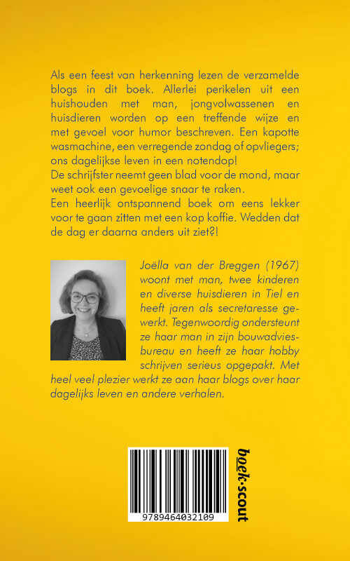 Als een feest van herkenning lezen de verzamelde blogs in dit boek. Allerlei perikelen uit een huishouden met man, jongvolwassenen en huisdieren worden op een treffende wijze en met gevoel voor humor beschreven. Een kapotte wasmachine, een verregende zondag of opvliegers; ons dagelijkse leven in een notendop! De schrijfster neemt geen blad voor de mond, maar weet ook een gevoelige snaar te raken. Een heerlijk ontspannend boek om eens lekker voor te gaan zitten met een kop koffie. Wedden dat de dag er daarna anders uit ziet?!
