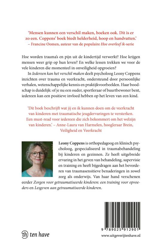 In Iedereen kan het verschil maken deelt psycholoog Leony Coppens inzichten over trauma en veerkracht, geïllustreerd met persoonlijke verhalen en praktijkvoorbeelden. Voor iedereen die een positieve impact wil hebben op het leven van een kind, biedt dit boek waardevolle inzichten en inspiratie.