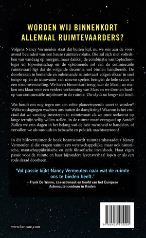WORDEN WIJ BINNENKORT ALLEMAAL RUIMTEVAARDERS? Volgens Nancy Vermeulen staat dat buiten kijf, nu we ons aan de vooravond bevinden van een heuse ruimterevolutie. Die zal zich niet voltrekken van vandaag op morgen, maar dankzij de combinatie van toptechnologie en topwetenschap en de opkomende rol van de commerciële ruimtevaart ligt dat de volgende decennia wel binnen handbereik. De doorbraken in bemande en onbemande ruimtevaart volgen elkaar in snel tempo op en de innovaties van nieuwe spelers brengen de hele sector in een stroomversnelling. We keren binnenkort terug naar de Maan, we maken ons klaar voor een verdere verkenning van Mars en we dromen hardop van commerciële mijnbouw in de ruimte. The sky is no longer the limit. Wat houdt ons nog tegen om een echte planeetvarende soort te worden? Welke uitdagingen wachten ons buiten de dampkring? Waarom is het cruciaal dat we vandaag investeren in ruimtevaart als we onze toekomst op lange termijn veilig willen stellen, in de ruimte maar evengoed op Aarde? Zullen we erin slagen in het belang van de hele mensheid te handelen, of vervallen we als vanouds in hebzucht en politiek machtsvertoon? In dit blikverruimende boek beantwoordt ruimteambassadeur Nancy Vermeulen al die vragen vanuit een wetenschappelijke, maar ook historische, maatschappijkritische en zelfs filosofische invalshoek. Haar eigen passie voor de ruimte en haar bijzondere levensverhaal lopen er als een rode draad doorheen.