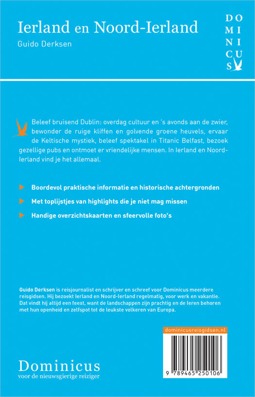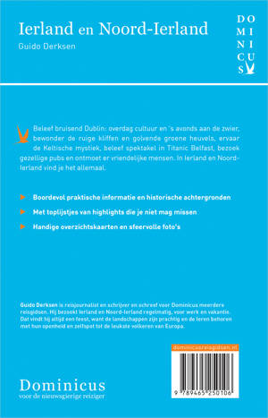 Deze reisgids staat boordevol praktische informatie, historische achtergronden, handige overzichtskaarten, sfeervolle foto's en uitgebreide culturele achtergrondinformatie, is altijd up-to-date en geschreven door een Nederlandstalige expert. Guido Derksen is reisjournalist en schrijver en schreef voor Dominicus meerdere reisgidsen. Hij bezoekt Ierland en Noord-Ierland regelmatig, voor werk en vakantie. Dat is altijd een feest, want de landschappen zijn prachtig en de Ieren behoren met hun openheid en zelfspot tot de leukste volkeren van Europa.
