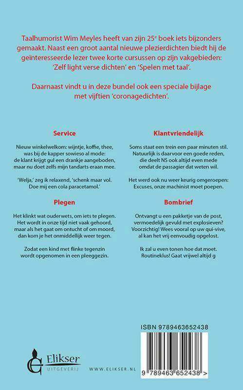 Taalhumorist Wim Meyles heeft van zijn 25e boek iets bijzonders gemaakt. Naast een groot aantal nieuwe plezierdichten biedt hij de geïnteresseerde lezer twee korte cursussen op zijn vakgebieden: ‘Zelf light verse dichten’ en ‘Spelen met taal’. Daarnaast vindt u in deze bundel ook een speciale bijlage met een vijftiental ‘coronagedichten’. Service