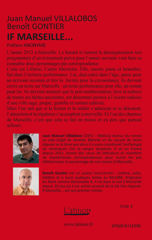 L'année 2012 à Marseille. Le hasard et surtout la désorganisation très programmée d'un événement prévu pour l'année suivante vont faire se connaître deux personnages par correspondance. L'une est Lilloise, l'autre Mexicain. Elle, encore jeune et branchée, fait dans l'écriture-performance. Lui, déjà entré dans l'âge, passe pour un écrivain reconnu et très lu. Invités pour la circonstance, ils devront écrire un texte sur Marseille : un texte-performance pour elle, un roman pour lui. Ils devront montrer que le port méditerranéen, lavé et nettoyé de toutes ses tâches anciennes, est désormais promis à l'avenir radieux d'une ville sage, propre et gentille et surtout cultivée. Mais l'on sait que si la fiction et la réalité s'admirent et se détestent, l'attraction et la répulsion s'accouplent à merveille. Et l'un des charmes de Marseille, c'est que cela se fait en mieux et en pire que partout ailleurs.