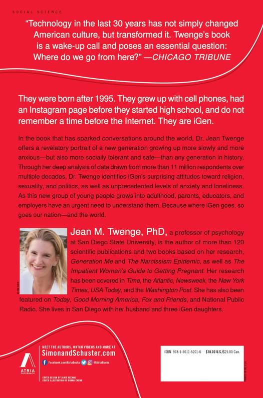 Born in the mid-1990s up to the mid-2000s, iGen is the first generation to spend their entire adolescence in the age of the smartphone. With social media and texting replacing other activities, iGen spends less time with their friends in person--perhaps contributing to their unprecedented levels of anxiety, depression, and loneliness.