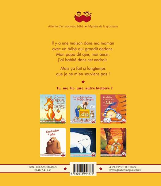 « Il y a une maison dans ma maman, avec un bébé qui grandit dedans. Mon papa dit que, moi aussi, j’ai habité dans cet endroit. Mais ça fait si longtemps que je ne m’en souviens pas ! » Une histoire pour raconter les mystères de la grossesse aux tout-petits.