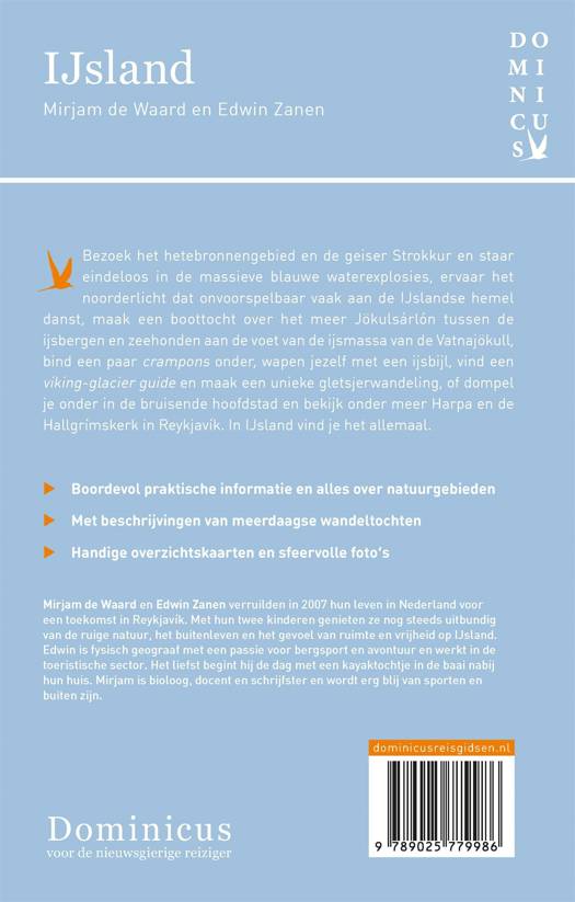 Mirjam de Waard en Edwin Zanen verruilden in 2007 hun Hollandse leventje voor een toekomst in Reykjavík. Met hun twee kinderen genieten zij nog steeds uitbundig van de ruige natuur, het buitenleven en het gevoel van ruimte en vrijheid op IJsland. Edwin is fysisch geograaf met een passie voor bergsport en avontuur en werkt in de toeristische sector. Het liefst begint hij de dag met een kajaktochtje in de baai nabij hun huis. Mirjam is bioloog, docent en schrijfster en wordt erg blij van sporten en buiten zijn.