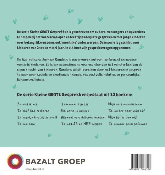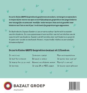 Dit boek maakt deel uit van de serie Kleine GROTE Gesprekken. Deze serie is geschreven om ouders, verzorgers en opvoeders te helpen bij het voeren van open en leeftijdsadequate gesprekken met jonge kinderen over belangrijke en soms ook ‘moeilijke’ onderwerpen. Geschikt voor kinderen van 2 tot en met 8 jaar en een waardevolle aanvulling op de opvoeding thuis, op school of in de kinderopvang. In elk boek zijn gespreksvragen opgenomen.