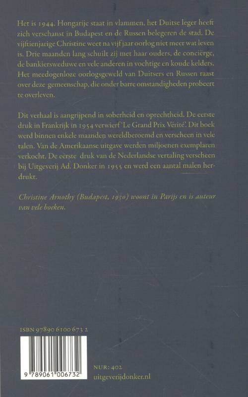 Het is 1944. Hongarije staat in vlammen, het Duitse leger heeft zich verschanst in Budapest en de Russen belegeren de stad. De vijftienjarige Christine weet na vijf jaar oorlog niet meer wat leven is. Drie maanden lang schuilt zij met haar ouders, de conci?rge, de bankiersweduwe en vele anderen in vochtige en koude kelders. Het meedogenloze oorlogsgeweld van Duitsers en Russen raast over deze gemeenschap, die onder barre omstandigheden probeert te overleven.