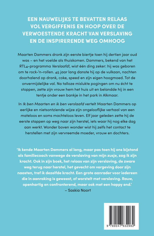 Maarten Dammers dronk zijn eerste biertje toen hij dertien jaar oud was – en het voelde als thuiskomen. Dammers, bekend van het RTL4-programma Verslaafd!, wist één ding zeker: hij was geboren om te rock-’n-rollen. 45 jaar lang danste hij op de vulkaan, nachten doorhalend op drank, coke, speed en zijn eigen hoogmoed. Tot de onvermijdelijke val. Na talloze mislukte pogingen om nu écht te stoppen, zette zijn vrouw hem het huis uit en belandde hij in een tentje onder een bankje in het park in Alkmaar. In Ik ben Maarten en ik ben verslaafd vertelt Maarten Dammers op eerlijke en nietsontziende wijze zijn ongelooflijke verhaal van een mateloos en soms machteloos leven. Elf jaar geleden zette hij de eerste stappen op weg naar zijn herstel, iets waar hij nog elke dag aan werkt. Wonder boven wonder wist hij zelfs het contact te herstellen met zijn vervreemde moeder, vrouw en dochters.