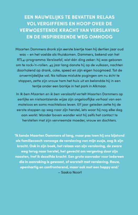 Een nauwelijks te bevatten relaas vol vergiffenis en hoop over de verwoestende kracht van verslaving en de inspirerende weg omhoog. Maarten Dammers dronk zijn eerste biertje toen hij dertien jaar oud was - en het voelde als thuiskomen. Dammers, bekend van het RTL4-programma Verslaafd!, wist één ding zeker: hij was geboren om te rock-'n-rollen. 45 jaar lang danste hij op de vulkaan, nachten doorhalend op drank, coke, speed en zijn eigen hoogmoed. Tot de onvermijdelijke val. Na talloze mislukte pogingen om nu écht te stoppen, zette zijn vrouw hem het huis uit en belandde hij in een tentje onder een bankje in het park in Alkmaar. In Ik ben Maarten en ik ben verslaafd vertelt Maarten Dammers op eerlijke en nietsontziende wijze zijn ongelooflijke verhaal van een mateloos en soms machteloos leven. Tien jaar geleden zette hij de eerste stappen op weg naar zijn herstel, iets waar hij nog elke dag aan werkt. Wonder boven wonder wist hij zelfs het contact te herstellen met zijn vervreemde moeder, vrouw en dochters. 'Een absolute aanrader. Rauw, openhartig en confronterend.' - Saskia Noort