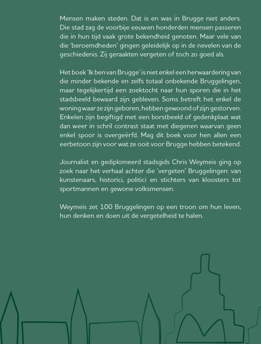 Het boek ’Ik ben van Brugge’ is niet enkel een herwaardering van die minder bekende en zelfs totaal onbekende Bruggelingen, maar tegelijkertijd een zoektocht naar hun sporen die in het stadsbeeld bewaard zijn gebleven. Soms betreft het enkel de woning waar ze zijn geboren, hebben gewoond of zijn gestorven. Enkelen zijn begiftigd met een borstbeeld of gedenkplaat wat dan weer in schril contrast staat met diegenen waarvan geen enkel spoor is overgeërfd. Mag dit boek voor hen allen een eerbetoon zijn voor wat ze ooit voor Brugge hebben betekend.