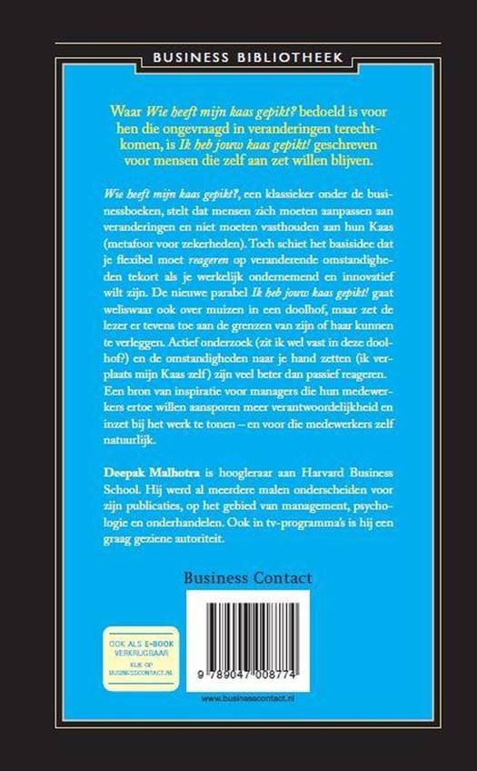 Wie heeft mijn kaas gepikt?, een klassieker onder de businessboeken, stelt dat mensen zich moeten aanpassen aan veranderingen en niet moeten vasthouden aan hun Kaas, metafoor voor zekerheden. Toch schiet het basisidee dat je flexibel moet reageren op veranderende omstandigheden tekort als je werkelijk ondernemend en innovatief wilt zijn. De nieuwe parabel Ik heb jouw kaas gepikt! gaat ook over muizen in een doolhof, maar zet de lezer ertoe aan de grenzen van zijn of haar kunnen te verleggen. Actief onderzoek (zit ik wel vast in deze doolhof?) en de omstandigheden naar je hand zetten (ik verplaats mijn Kaas zelf) zijn veel beter dan passief reageren. Waar Wie heeft bedoeld is voor hen die ongevraagdin veranderingen terechtkomen, is Ik heb jouw kaas gepikt! geschreven voor mensen die zelf aan zet willen blijven. Dit boek is een bron van inspiratie voor managers die hun medewerkers ertoe willen aansporen meer verantwoordelijkheid en inzet bij het werk te tonen en voor die medewerkers zelf natuurlijk.