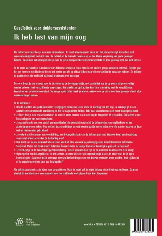 Als doktersassistent ben je een ware duizendpoot. Je voert uiteenlopende taken uit. Het beroep brengt bovendien veel verantwoordelijkheid met zich mee: de patiënt en de huisarts rekenen op je. Een kleine vergissing kan grote gevolgenhebben. Daarom is het belangrijk dat je over de juiste competenties en kennis beschikt en deze geïntegreerd toe kunt passen.In de serie werkboeken ‘Casuïstiek voor doktersassistenten’ staat steeds een andere groep patiënten centraal. Telkens gaat het om mensen met klachten die op het eerste gezicht op elkaar lijken maar die verschillende oorzaken hebben. Zo hebben de patiënten in dit werkboek allemaal problemen met hun ogen.De serie helpt je om je goed voor te bereiden op de beroepspraktijk, met casuïstiek kun je op een prettige en veilige manier oefenen met verschillende zorgvragen. Via praktische opdrachten kom je in aanraking met de verschillendeDe serie helpt je om je goed voor te bereiden op de beroepspraktijk, met casuïstiek kun je op een prettige en veilige manier oefenen met verschillende zorgvragen. Via praktische opdrachten kom je in aanraking met de verschillende kern taken van de doktersassistent. Sommige opdrachten maak je alleen, andere voer je uit in een klein groepje of met al je medeleerlingen samen.In dit werkboek: • Om de klachten van patiënten beter te begrijpen bestudeer je de bouw en werking van het oog. Je verdiept je in een aantal veel voorkomende aandoeningen die tot oogklachten leiden, kijkt naar alarmfactoren en voert intakegesprekken.• Je leert hoe je een visustest uitvoert en wat de juiste manier is om een oog te druppelen of te spoelen. Ook oefen je met het aanleggen van een oogverband.• Je maakt kennis met een aantal geneesmiddelen die gebruikt worden bij de behandeling van oogklachten en hunachterliggende oorzaken. Hoe werken deze medicijnen en wat moet je patiënten vertellen over de manier waarop ze deze wel en niet moeten gebruiken?• Je oefent met het geven van voorlichting, een belangrijke taak van de doktersassistent. Waarom komt een boodschap soms heel anders over dan de bedoeling was?• Ook komt een aantal administratieve taken aan bod. Hoe verwerk je patiëntgegevens in het Huisartsen Informatie Systeem? Wat is het Elektronisch Patiënten Dossier dat in de nabije toekomst landelijk ingevoerd zal worden?• Je verdiept je in de tweedelijns gezondheidszorg: welke specialismen zijn er en waarmee houden deze zich bezig?• Ogen spelen een belangrijke rol in het contact, mensen voelen zich ongemakkelijk als ze de ander niet in de ogen kunnen kijken. Daarom vinden sommige mensen dat het dragen van een boerka verboden moet worden. Vind jij dat ook of is godsdienstvrijheid voor jou belangrijker?Als doktersassistent sta je klaar voor de patiënten. Maar je moet ook je eigen belang niet uit het oog verliezen. Daarom eindigt dit werkboek met een opdracht over verschillende werkstijlen die je kunt toepassen.