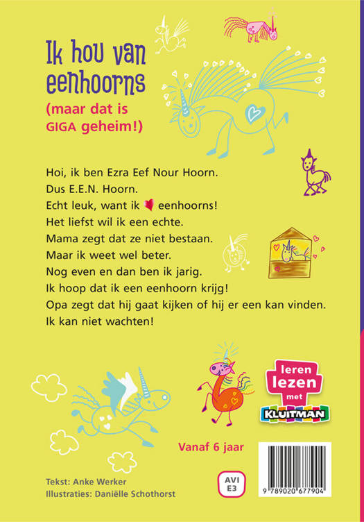 Het eerste deel in een nieuwe serie van Anke Werker en Daniëlle Schothorst. Samen bedachten ze een magische wereld vol eenhoorns. Ook echte? Daar is Ezra in ieder geval van overtuigd! Ook al zegt haar moeder dat eenhoorns niet bestaan. Gelukkig weet haar opa wel beter. Hij belooft een echte eenhoorn te regelen voor haar verjaardag. Maar daar moet Ezra wel wat voor doen!