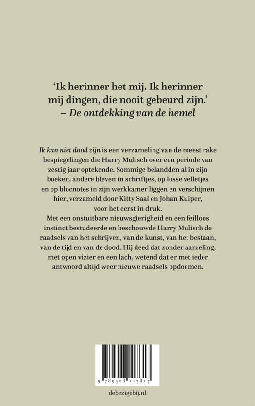 Ik kan niet dood zijn is een verzameling van de meest rake bespiegelingen die Harry Mulisch over een periode van zestig jaar optekende. Sommige belandden al in zijn boeken, andere bleven in schriftjes, op losse velletjes en op blocnotes in zijn werkkamer liggen en verschijnen hier, verzameld door Kitty Saal en Johan Kuiper, voor het eerst in druk. Met een onstuitbare nieuwsgierigheid en een feilloos instinct bestudeerde en beschouwde Harry Mulisch de raadsels van het schrijven, van de kunst, van het bestaan, van de tijd en van de dood. Hij deed dat zonder aarzeling, met open vizier en een lach, wetend dat er met ieder antwoord altijd weer nieuwe raadsels opdoemen.
