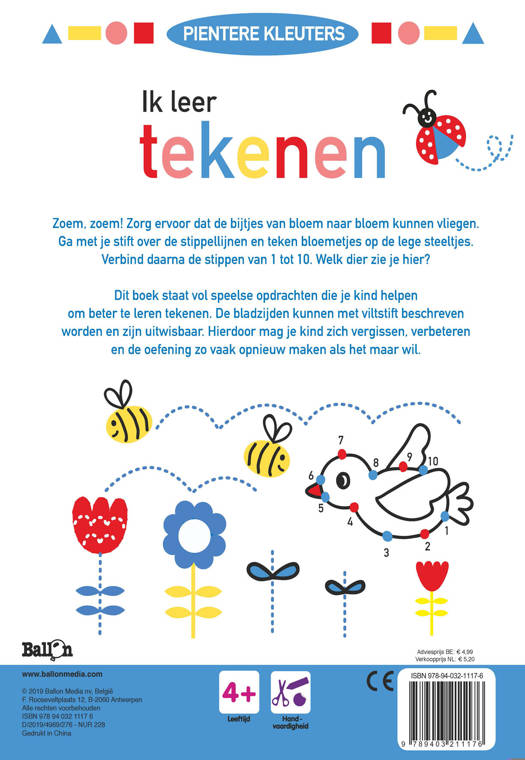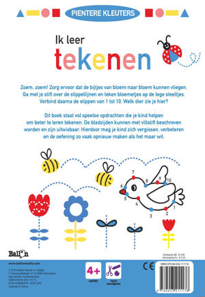 Zoem, zoem! Zorg ervoor dat de bijtjes van bloem naar bloem kunnen vliegen. Ga met je stift over de stippellijnen en teken bloemetjes op de lege steeltjes. Verbind daarna de stippen van 1 tot 10. Welk dier zie je hier? Dit boek staat vol speelse opdrachten die kinderen vanaf 4 jaar helpen om beter te leren tekenen. De bladzijden kunnen met viltstift beschreven worden en zijn uitwisbaar. Hierdoor mag je kind zich vergissen, verbeteren en de oefening zo vaak opnieuw maken als het maar wil. De speciale pen om op de uitwisbare pagina's te schrijven wordt gratis meegeleverd.