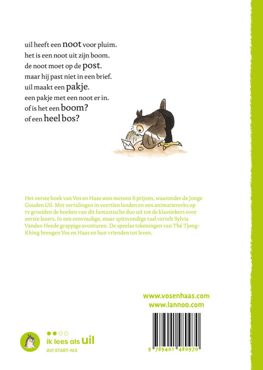 uil heeft een noot voor pluim. het is een noot uit zijn boom. de noot moet op de post. maar hij past niet in een brief. uil maakt een pakje. een pakje met een noot er in. of is het een boom? of een heel bos? Vos en Haas zijn klassiekers voor eerste lezers. In een eenvoudige, maar spitsvondige taal vertelt Sylvia Vanden Heede grappige avonturen. De speelse tekeningen van Thé Tjong-Khing brengen Vos en Haas en hun vrienden tot leven. AVI START TOT M3