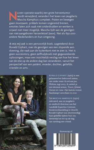 Ik mis mij ook is een persoonlijk boek, opgetekend door Ronald Giphart, over de gevolgen van een slopende aandoening, die vaak aan de buitenkant niet te zien is. Het is geen successtory, geen zelfhulpboek met gegarandeerde oplossingen, maar een inzichtelijk verslag van hoe het leven van de ene op de andere dag kan veranderen, vanuit het perspectief van een patiënt, moeder, dochter, geliefde, vriendin en arts.