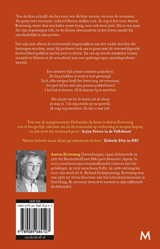 ‘Anton Korteweg verklapt […] de titel van een nieuwe bundel gedichten: Ik, om maar iemand te noemen. Dat is passende zelfspot in een tijd waarin de literatuur op het narcistische af persoonlijk is geworden.’ Carel Peeters in Vrij Nederland