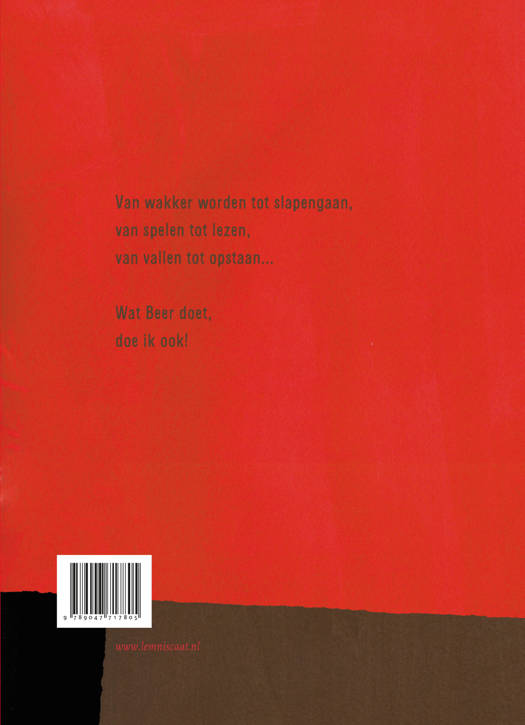 Iedere peuter en kleuter heeft wel iemand tegen wie hij opkijkt: of het nou een ouder is, een grote zus of een ingebeeld speelmaatje. Ik heeft Beer. En met Beer brengt Ik de hele dag door, van het wakker worden tot het slapengaan, van spelen tot lezen, van vallen tot opstaan… In heldere kleuren en vrolijke vormen beleeft Ik (en de lezer/kijker) de hele dag met Beer. Om de volgende dag opnieuw te beginnen, want dit boek zul je altijd blijven oppakken, generaties lang.