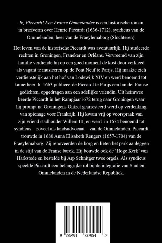 Ik, Piccardt! is een historische roman in briefvorm over Henric Piccardt (1636-1712), syndicus van de Ommelanden en heer van de Fraeylemaborg. Het leven van de historische Piccardt was avontuurlijk. Hij studeerde rechten in Groningen, Franeker en Orléans. Vervreemd van zijn familie verdiende hij op een goed moment de kost door verkleed als vagant te musiceren op de Pont Neuf te Parijs. Hij maakte zich verdienstelijk aan het hof van Lodewijk XIV, de Zonnekoning, en werd benoemd tot kamerheer. In 1663 publiceerde Piccardt te Parijs een bundel Franse gedichten, opgedragen aan een adellijke vriendin. Uit heimwee keerde Piccardt in het Rampjaar1672 terug naar Groningen waar hij prompt na Groningens Ontzet gearresteerd werd op verdenking van spionage voor Frankrijk. Hij kwam vrij op voorspraak van zijn vriend stadhouder Willem III, en werd in 1674 benoemd tot syndicus – zoveel als landsadvocaat – van de Ommelanden. Piccardt trouwde in 1680 Anna Elisabeth Rengers (1657-1704) van de Fraeylemaborg. Zij renoveerden de borg en lieten het park aanleggen in de stijl van de Franse barok. Hij bouwde ook de ‘Hoge Kerk’ van Harkstede en bestelde bij Arp Schnitger twee orgels. Als syndicus speelde Piccardt een belangrijke rol bij de integratie van Stad en Ommelanden in de Nederlandse Republiek. Deze gefingeerde brief van Piccardt is gericht aan Jean-Henry d’Anglebert (1635-1691), musicus aan het hof van Lodewijk XIV. D’Angleberts muziek vormt een continuo in de brief. Twee thema’s zijn Piccardts wankelmoedig geloof en zijn grote liefde voor Anna Rengers, afgezet tegen zijn eerdere escapades. Gebruik werd o.a. gemaakt van zijn bundel gedichten en de verslagen van zijn gerechtelijk verhoor in 1672, die bewaard worden in de Groninger Archieven.