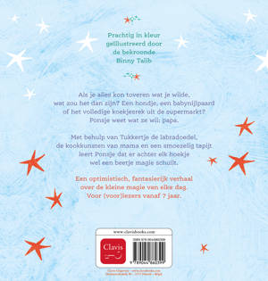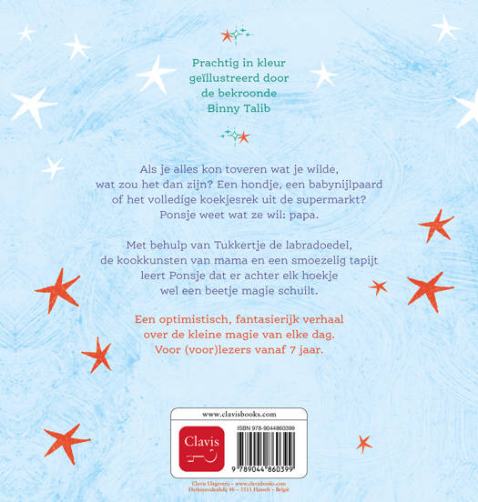 Als je alles kon toveren wat je wilde, wat zou het dan zijn? Een hondje, een babynijlpaard of het volledige koekjesrek uit de supermarkt? Ponsje weet wat ze wil: papa. Met behulp van Tukkertje de labradoedel, de kookkunsten van mama en een smoezelig tapijt leert Ponsje dat er achter elk hoekje wel een beetje magie schuilt. Een optimistisch, fantasierijk verhaal over de kleine magie van elke dag. Voor (voor)lezers vanaf 7 jaar.