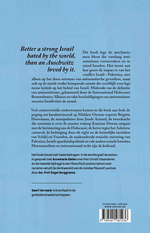 Dit boek legt de mechanismen bloot die vandaag antisemitisme veroorzaken en in stand houden. Het toont aan hoe groot de impact is van het conflict Israël-Palestina, niet alleen op het doen ontstaan van antisemitische gevoelens, maar ook op de steeds verder krimpende ruimte die overblijft voor legitieme kritiek op het beleid van Israël. Misbruik van de definitie van antisemitisme, gehanteerd door de International Holocaust Remembrance Alliance en valse beschuldigingen van antisemitisme snoeren Israëlcritici de mond.