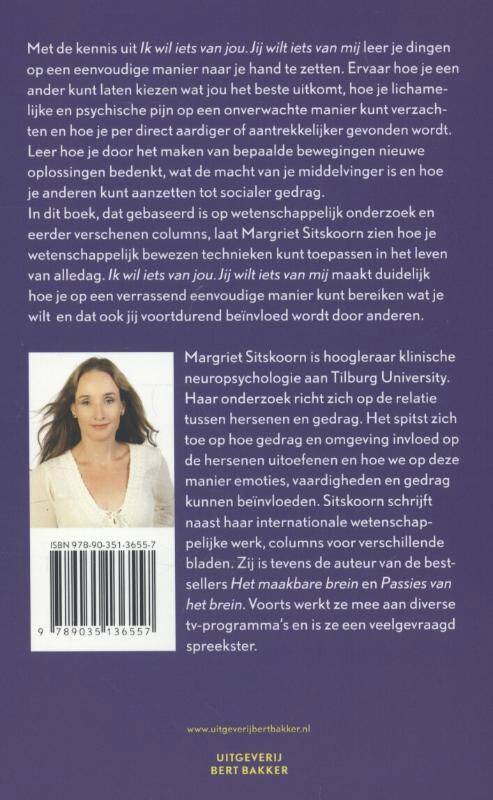 Met de kennis uit Ik wil iets van jou, jij wilt iets van mij leer je dingen op een eenvoudige manier naar je hand te zetten. Ervaar hoe je een ander kunt laten kiezen wat jou het beste uitkomt, hoe je lichamelijke en psychische pijn op een onverwachte manier kunt verzachten en hoe je per direct aardiger of aantrekkelijker gevonden wordt. Leer hoe je door het maken van bepaalde bewegingen nieuwe oplossingen bedenkt, wat de macht van je middelvinger is en hoe je anderen kunt aanzetten tot socialer gedrag. In dit boek, dat gebaseerd is op wetenschappelijk onderzoek en eerder verschenen columns, laat Margriet Sitskoorn zien hoe je wetenschappelijk bewezen technieken kunt toepassen in het leven van alledag. Ik wil iets van jou, jij wilt iets van mij maakt duidelijk hoe je op verrassend eenvoudige manier kunt bereiken wat je wilt, maar dat jij ook voortdurend beïnvloed wordt door anderen.