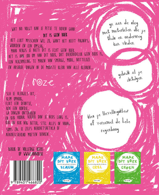 Maar vergis je niet! Dit is geen echt boek. Het is aan jou om van dit boek, dat overduidelijk geen boek is, een verzameling te maken van smerige, mooie, nutteloze en absurde dingen in de mooiste kleur van alle kleuren... Roze!