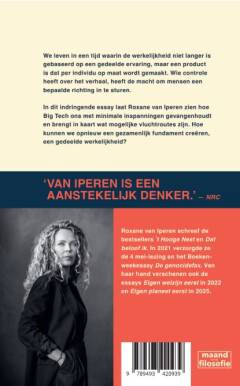 We leven in een tijd waarin de werkelijkheid niet langer is gebaseerd op een gedeelde ervaring, maar een product is dat per individu op maat wordt gemaakt. Wie controle heeft over het verhaal, heeft de macht om mensen een bepaalde richting in te sturen. In dit indringende essay laat Roxane van Iperen zien hoe Big Tech ons met minimale inspanningen gevangenhoudt en brengt in kaart wat mogelijke vluchtroutes zijn. Hoe kunnen we opnieuw een gezamenlijk fundament creëren, een gedeelde werkelijkheid?