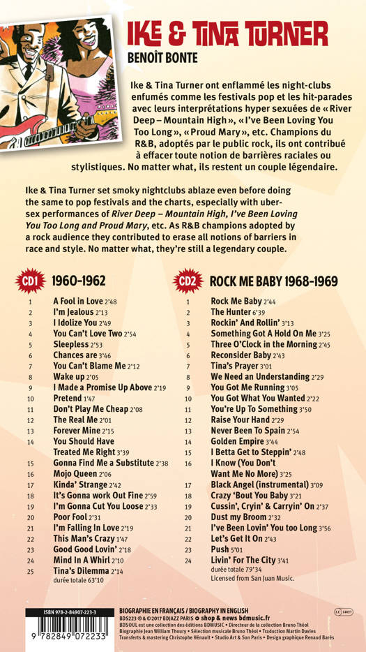 La naissance du couple le plus explosif de la scène soul des années cinquante et soixante, racontée par Jean William Thoury, illustrée par Benoit Bonte, accompagnée de 2 compact discs.<br /><br /> Ike & Tina Turner ont enflammé les night-clubs enfumés comme les festivals pop et les hit-parades avec leurs interprétations hyper sexuées de « River Deep – Mountain High », « I’ve Been Loving You Too Long », « Proud Mary », etc. Champions du R&B, adoptés par le public rock, ils ont contribué à effacer toute notion de barrières raciales ou stylistiques. No matter what, ils restent un couple légendaire.<br /> Ike & Tina Turner set smoky nightclubs ablaze even before doing the same to pop festivals and the charts, especially with uber-sex performances of River Deep – Mountain High, I’ve Been Loving You Too Long and Proud Mary, etc. As R&B champions adopted by a rock audience they contributed to erase all notions of barriers in race and style. No matter what, they're still a legendary couple.<br /><br /> IKE & TINA TURNER CD 1 – 1960 - 1962<br /><br /> 1. A Fool in Love 2’48<br /> 2. I’m Jealous 2’13<br /> 3. I Idolize You 2’49<br /> 4. You Can’t Love Two 2’54<br /> 5. Sleepless 2’53<br /> 6. Chances are 3’46<br /> 7. You Can’t Blame Me 2’12<br /> From the album The Soul of Ike & Tina Turner, Recorded 1960 & 1961, Ike Turner (guitar, piano and backing vocals), Tina Turner (lead vocal), The Ikettes : Robbie Montgomery, Sandra Harding, Frances Hodges (female backing vocals). A Sue Records production released in 1961<br /><br /> 8. Wake up 2’05<br /> 9. I Made a Promise Up Above 2’19<br /> 10. Pretend 1’47<br /> 11. Don’t Play Me Cheap 2’08<br /> 12. The Real Me 2’01<br /> 13. Forever Mine 2’15<br /> From the album Don’t Play Me Cheap, recorded in 1961 & 1962, Ike Turner (guitar, piano and backing vocals), Tina Turner (lead vocal) with The Ikettes : Robbie Montgomery, Sandra Harding, Frances Hodges (female backing vocals). A Sue Records production released early 1962<br /><br /> 14. You Should Have Treated Me Right 3’39<br /> Single issued in June 1962<br /><br /> 15. Gonna Find Me a Substitute 2’38<br /> 16. Mojo Queen 2’06<br /> 17. Kinda’ Strange 2’42<br /> 18. It’s Gonna work Out Fine (Joe Seneca, Rose Marie McCoy, Sylvia McKinney) 2’59<br /> 19. I’m Gonna Cut You Loose 2’33<br /> 20. Poor Fool 2’31<br /> 21. I’m Falling In Love 2’19<br /> 22. This Man’s Crazy 1’47<br /> 23. Good Good Lovin’ 2’18<br /> From the album It’s Gonna Work Out fine, Recorded in 1961 & 1962, Ike Turner (guitar, piano backing vocals), Tina Turner (lead vocal). <br /> On It’s Gonna Work Out Fine, probably Sylvia Vanderpool (guitar), Mickey Baker (piano), Robbie Montgomery, Eloise Faye, Wilhelmina Weaver (female backing vocals), unidentified bass and drums. A Sue Records production released end 1962<br /><br /> 24. Mind In A Whirl 2’10<br /> 25. Tina’s Dilemma 2’14<br /> Singles recorded in 1962. Ike Turner (guitar, piano backing vocals), Tina Turner (lead vocal). <br /> All songs composed by Ike Turner except when indicated<br /><br /> TOTAL CD 1 : 63’10<br /><br /><br /> IKE & TINA TURNER CD 2 – Rock Me Baby - 1963 - 1974<br /><br /><br /> 1. Rock Me Baby (King, Josea) 2’44<br /> 2. The Hunter (Booker, Jones, Wells, Jackson, Dunn) 6’39<br /> 3. Rockin’ And Rollin’ (I. Turner) 3’13<br /> 4. Something Got A Hold On Me (Woods, Kirkland, James) 3’25<br /> 5. Three O’Clock in the Morning (King, Taub), 2’45<br /> 6. Reconsider Baby (L. Fulson) 2’43<br /> 7. Tina’s Prayer (I. Turner) 3’01<br /> 8. We Need an Understanding (Turner, Northern, Bailey) 2’29<br /> 9. You Got Me Running (J. Reed) 3’05<br /> 10. You Got What You Wanted (I. Turner) 2’22<br /> 11. You’re Up To Something (I. Turner) 3’50<br /> 12. Raise Your Hand (I. Turner) 2’29<br /> 13. Never Been To Spain (Axton) 2’54<br /> 14. Golden Empire (I. Turner) 3’44<br /> 15. I Betta Get to Steppin’ (Turner, Harris) 2’48<br /> 16. I Know (You Don’t Want Me No More) (I. Turner) 3’25<br /> 17. Black Angel (instrumental) (O. Sain) 3’09<br /> 18. Crazy ‘Bout You Baby (W. Williamson, T. Turner)3’21<br /> 19. Cussin’, Cryin’ & Carryin’ On (Turner, Thompson) 2’37<br /> 20. Dust my Broom (I. Turner, E. James) 2’32<br /> 21. I’ve Been Lovin’ You too Long (O. Redding, J. Butler) 3’56<br /> 22. Let’s Get It On (I. Turner) 2’43<br /> 23. Push (I. Turner) 5’01<br /> 24. Livin’ For The City (S. Wonder) 3’41<br />