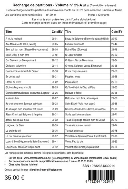 Cette recharge contient les chants de l’album 72. Elle comprend également les nouveaux chants des éditeurs externes ajoutés au carnet de chants Il est vivant, édition 2025. Ces partitions sont numérotées.