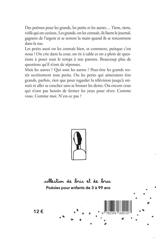 Des poèmes pour les grands, les petits et les autres... Tiens, tiens,voilà qui est curieux. Les grands, on les connaît, ils lisent le journal, gagnent de l'argent et se serrent la main quand ils se rencontrent dans la rue. Les petits aussi on les connaît bien, et comment, puisque c'est nous ! On crie dans la cour, on rit à table et on a plein de questions à poser tout le temps à nos parents. Beaucoup plus de questions qu'il n'ont de réponses. Mais les autres ? Qui sont les autres ? Peut-être les grands restés secrètement tout petits. Ou les petits qui aimeraient être grands, parfois, rien que pour regarder la télévision jusqu'à minuit et aller se coucher sans se brosser les dents. Ou encore ceux qui n'ont pas besoin de fermer les yeux pour rêver. Comme vous. Comme moi. N'est-ce pas ?