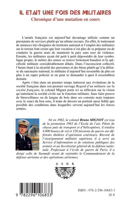 Dans l'inconscient collectif, l'heure étant à la sécurité des personnes et des biens plutôt qu'à la défense du sanctuaire national, le militaire d'aujourd'hui ressemble de plus en plus à un super policier et on peut se demander à quoi il ressemblera demain. L'auteur porte ici sa réflexion sur la vision qu'entretient la société civile sur la fonction militaire, et tente de dresser un portrait aussi fidèle que possible des conditions dans lesquelles servent aujourd'hui les forces armées.