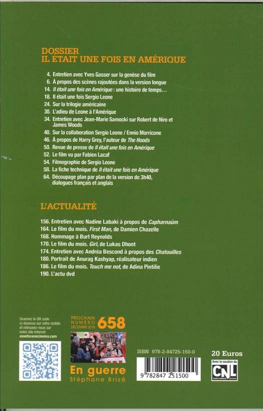 Scénario et découpage plan par plan du film de Sergio Leone sorti en 1984. Avec un dossier comprenant des contributions sur la genèse du film, les acteurs principaux ou encore la collaboration du metteur en scène avec Ennio Morricone. En complément, notamment : entretien avec Nadine Labaki (pour Capharnaüm) et avec Andréa Bescond (pour Les chatouilles).